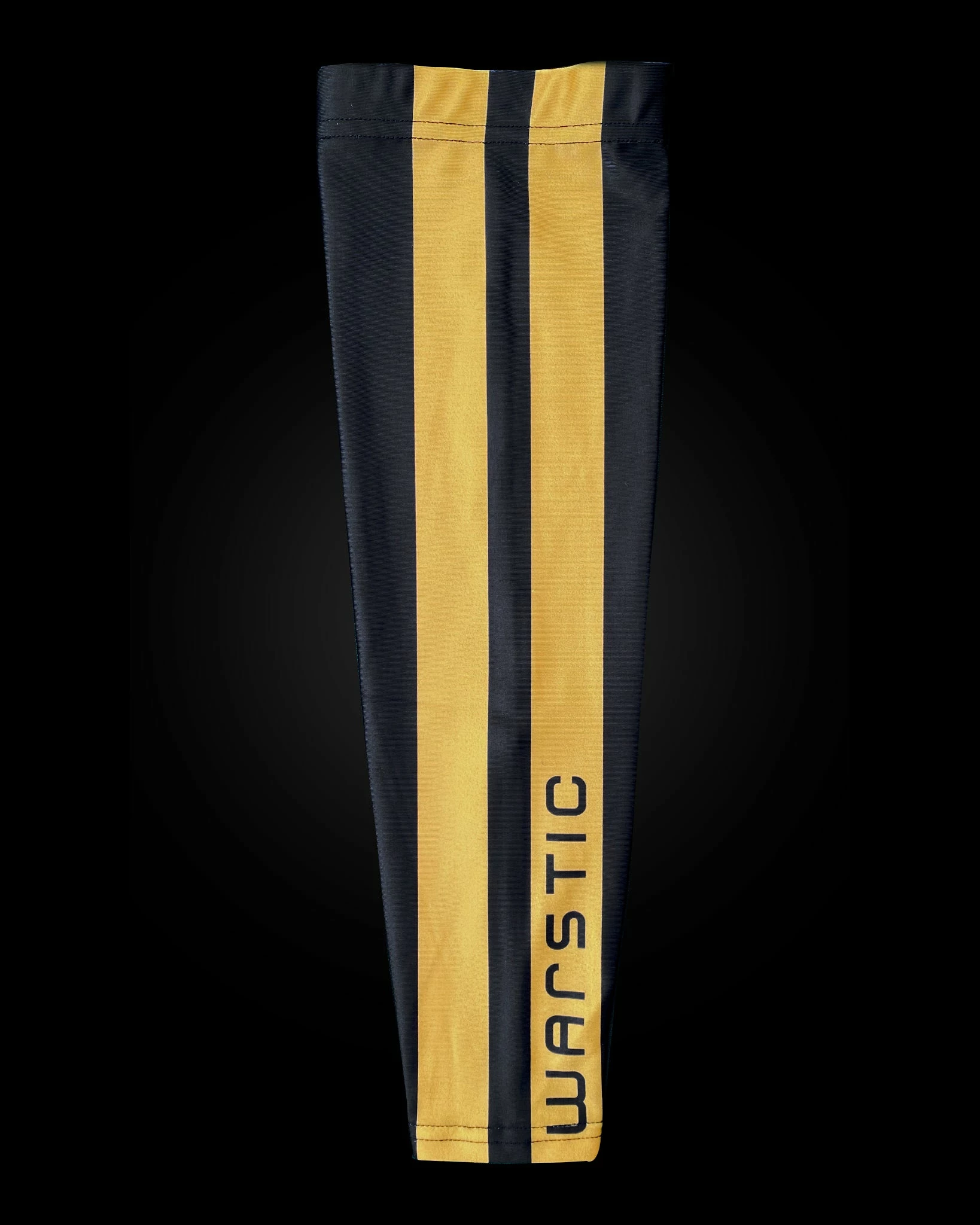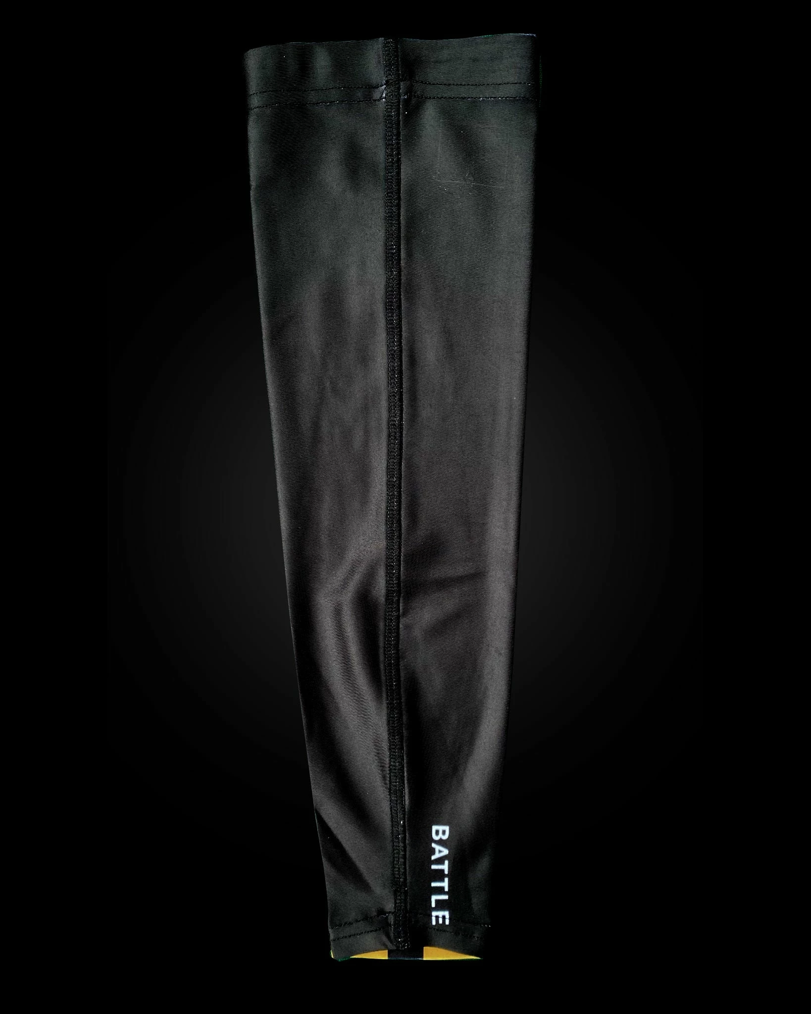 Made of black moisture wicking material to keep your arm cool on game day, while keeping your muscles primed and ready between at-bats and plays. Features our “Warstripe” logo in gold on front with “Warstic” in black at wrist, and “Battle” in white on the back at the wrist.
