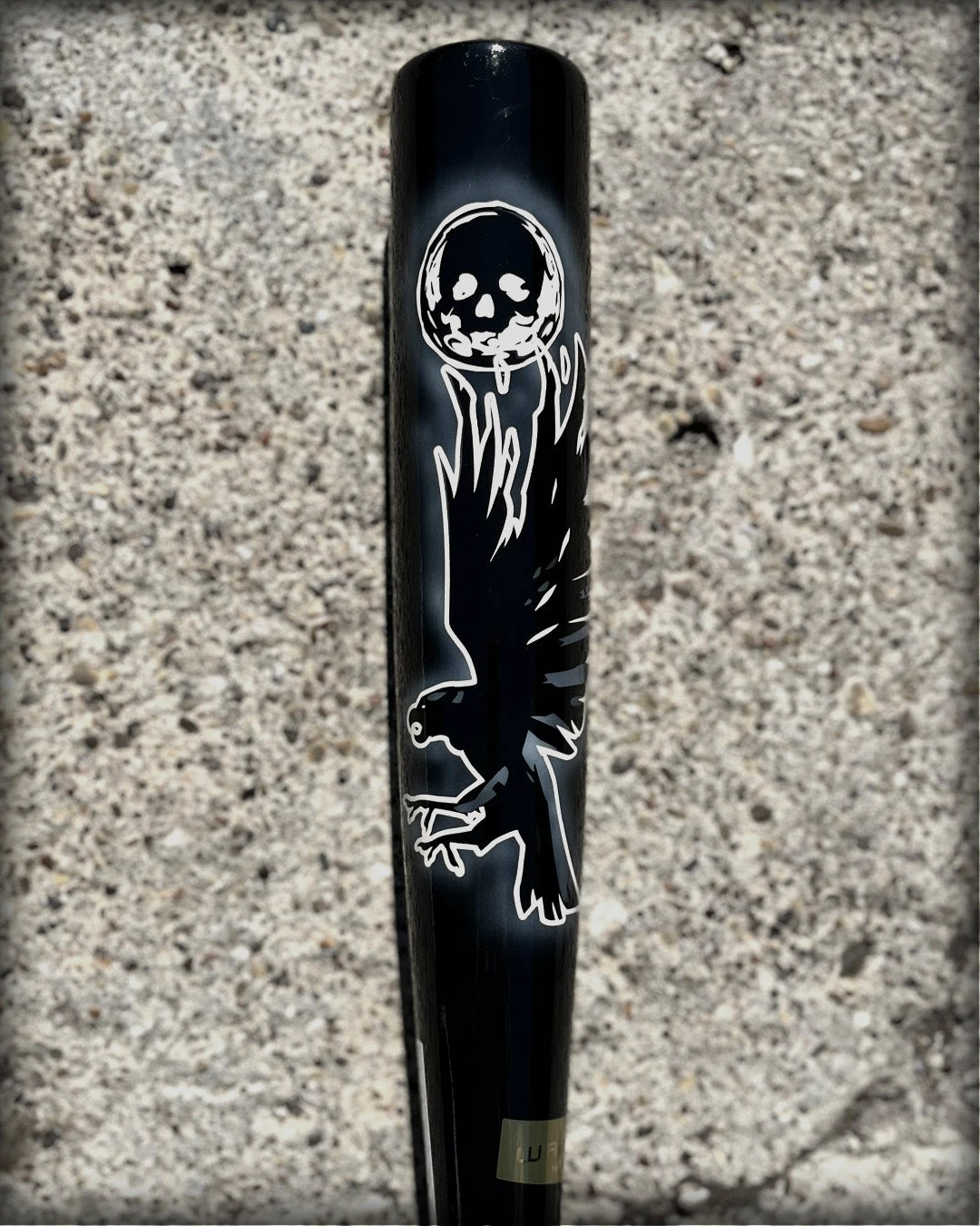 This Small Batch ‘Nightmare on Maple Street’ WSKP11 Wood Bat is wrapped with a clutching bone hand and screaming skull that’s sure to strike fear into anyone it faces. The opposite side features a raven, known to be the connector of the spirit and material world, as it flies passed a full lit moon.Â